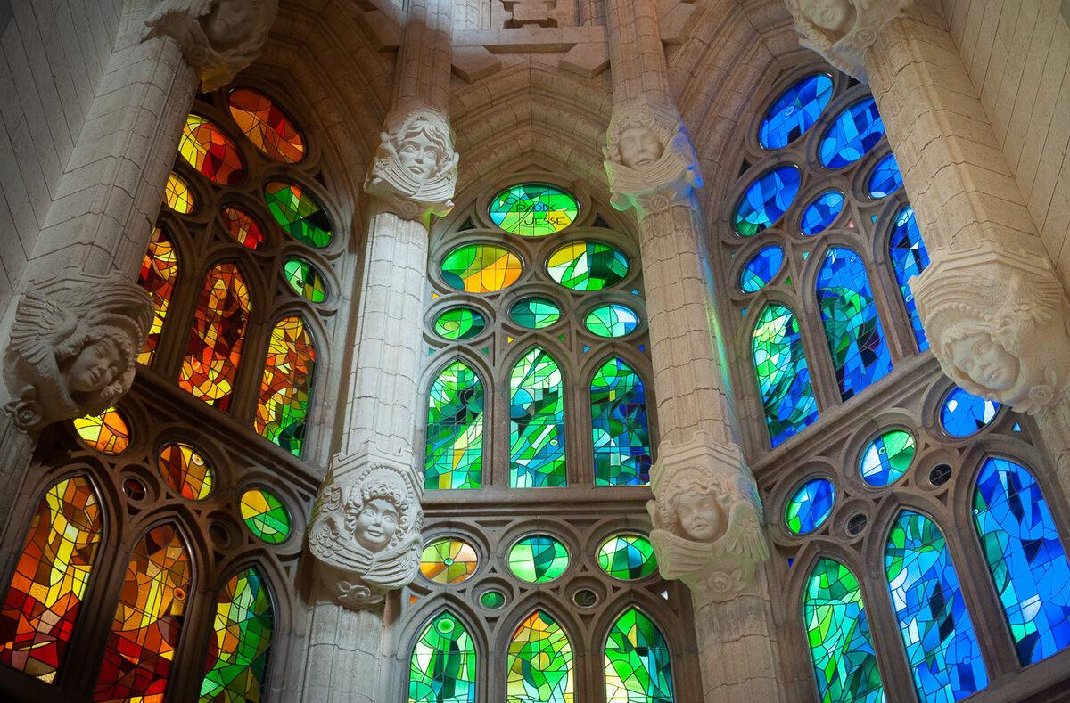 La Sagrada Familia Bazilikası'nın içi ziyaretçilerine görsel bir şölen ve ayrı bir dünya hissi sunar. Bazilika'nın iç dizaynı ziyaretçilerin gerçeklik algısını değiştiren ve ziyaretçilerde hayranlık uyandıran bir yöne sahiptir. Işık ve renk geçişli yüksek vitray camlarla kaplı pencereler, günün her saatinde Güneş ışınlarının farklı renk ve tonlarda içeri süzülmesini sağlayarak ziyaretçilerin üzerinde sürrealist bir etki yaratır. Dört element imgelemi ile dizayn edilmiş Vitray camlar ; havayı temsil eden yeşil, toprağı temsil eden sarı, ateşi temsil eden kırmızı ve suyu temsil eden mavi renklerden oluşmakta olup bazilikanın içinde günün her anı büyüleyici bir atmosfer yaratır.