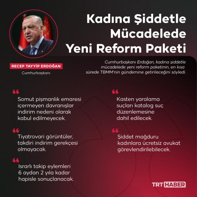 Cumhurbaşkanı Erdoğan, "Kasten öldürme, kasten yaralama, işkence ve eziyet gibi suçlar kadına karşı işlenmişse cezalar daha da artırılacaktır." dedi.