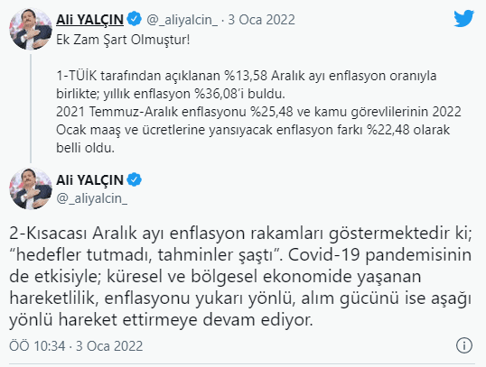 Memur-Sen Genel Başkanı Ali Yalçın ise, Twitter hesabından yaptığı açıklamada "Ek zam şart olmuştur" diyerek, "Enflasyon farkı memurun düşen alım gücünü yükseltmek için asla yeterli değildir" ifadelerini kullandı.