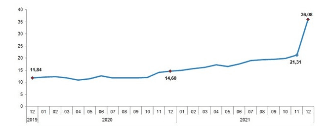 Tüketici fiyatları, 2021 aralık ayında aylık bazda yüzde 13,58 arttı. Kasımda yüzde 21,31 olan yıllık enflasyon aralık ayında yüzde 36,08'e yükseldi.