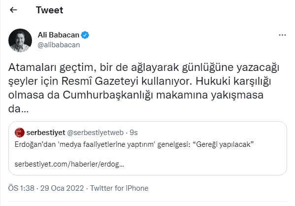 Atamaları geçtim, bir de ağlayarak günlüğüne yazacağı şeyler için Resmî Gazeteyi kullanıyor. Hukuki karşılığı olmasa da Cumhurbaşkanlığı makamına yakışmasa da…" ifadelerini kullandı.