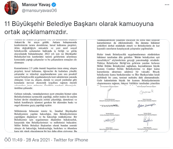 "2.5 yıl boyunca Belediyelerimizin yaptığı ve büyük takdir gören çalışmaların bir kesime rahatsızlık verdiğini görmekteyiz. Bu durumu anlayışla da karşılıyoruz. Kabul etmediğimiz durum ise hukukun dışına çıkılarak baskı ortamının oluşturulması, haksız ve mesnetsiz ithamlarla kurumlarımızın zan altında bırakılması ve birer devlet kurumu olan Belediyelerimiz üzerinden sürekli olarak kirli siyaset üretilme çabasıdır. Gelinen noktada, vatandaşlarımızı ayırt etmeden hizmet eden Belediyelerimize ayrımcılık yapıldığı, millet iradesi ile seçilen bizlere devlet olanaklarıyla zorluk çıkarıldığı, demokrasi ve hukuk kurallarıyla işlemesi gereken bir düzenden baskı ve engel düzenine geçiş yapıldığı açıktır. Milletimizin bilmesini isteriz ki, İstanbul Büyükşehir Belediyemize yapılan haksızlığın, tüm Belediyelerimize yapıldığını düşünüyor ve bu haksızlığı reddediyoruz. Bir Belediyemiz için uygulanması düşünülen hukuksuzluk, karşısında tüm Belediyelerimizi ve milletimizi bulacaktır."