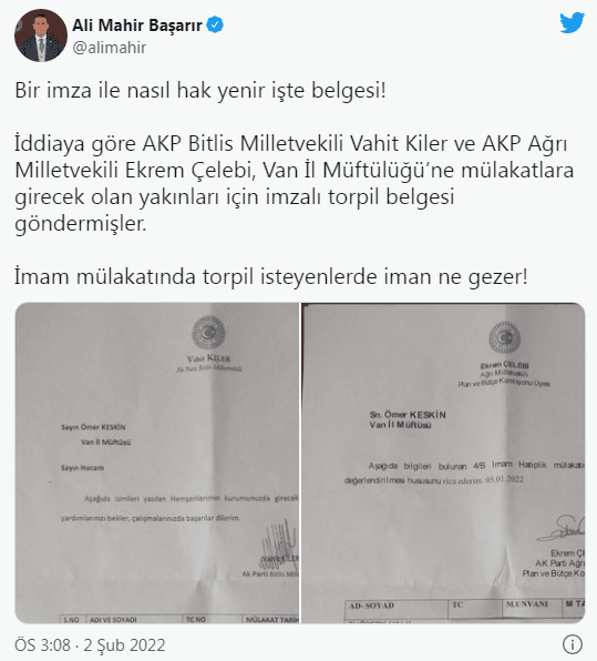 Başarır, Twitter hesabından yaptığı paylaşımda "Bir imza ile nasıl hak yenir işte belgesi! İddiaya göre AKP Bitlis Milletvekili Vahit Kiler ve AKP Ağrı Milletvekili Ekrem Çelebi, Van İl Müftülüğü’ne mülakatlara girecek olan yakınları için imzalı torpil belgesi göndermişler. İmam mülakatında torpil isteyenlerde iman ne gezer!" ifadelerine yer verdi.