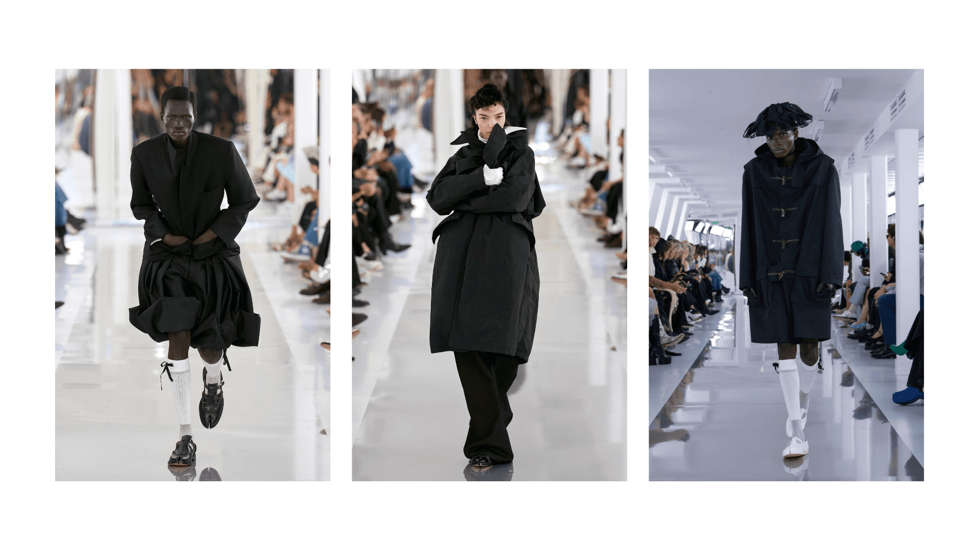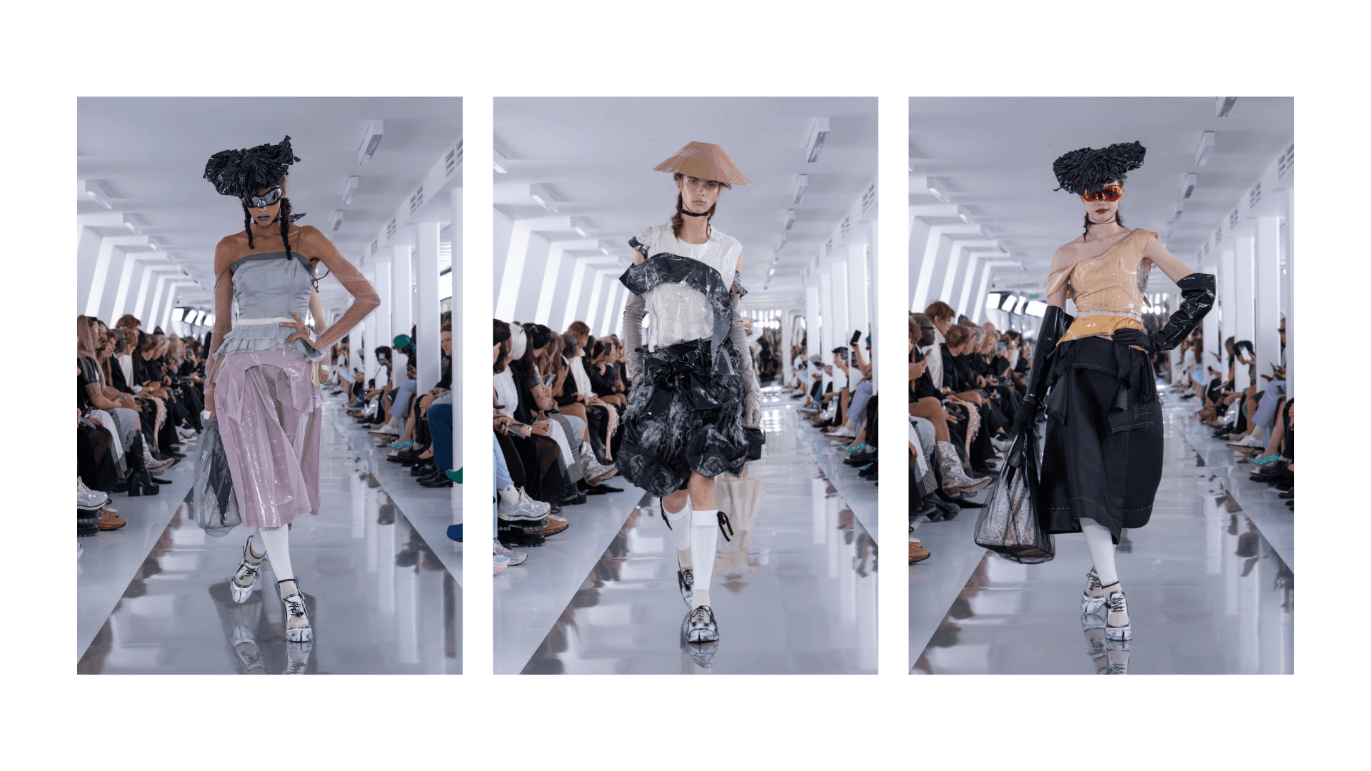 Bu defileyi izlediğiniz andan itibaren üstünüzde sebebini anlayamadığınız bir gerginlik olabilir. Modeller aceleci yürüyüşleri ya da sürekli göz kaçırmalarıyla sizi gerip küstah tavırlarıyla da sizi etkileyebilir. Her modelin giydiği tasarıma göre oynadığı personası inanılmaz derecede iyi ve keyifli. Kimisi poşetten ve demir parçalarından yapılmış delikli şapkalarının arasından bizleri süzerken kimisi gizemli tavırlarıyla bizi korkutuyor.