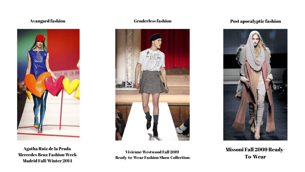 Post- apokaliptik moda da distopik ve post-apokaliptik geleceklere atıfta bulunan bir akımdır. Aşırı ve döküntü tarzda giyim, yıpranmış ve yamalı parçaların kullanımı gibi unsurlar içerir. Asıl ilhamını sıradanlığın ve sadece günümüzün modasını içeren kıyafetlerin sınırlılığından alarak geleceğe yönelik dağınıklık içeren bir akım olabilir. Cinsiyet algısı sınırları içinde olan modaya karşı cinsiyetsiz moda türemiştir. Hepsi kendi içinde sürekli olarak bir sonsuzluk çemberi çizerler. Ve biri diğerinin çemberini sınırlı bulup kendi sınırsız çemberini yaratmak ister.