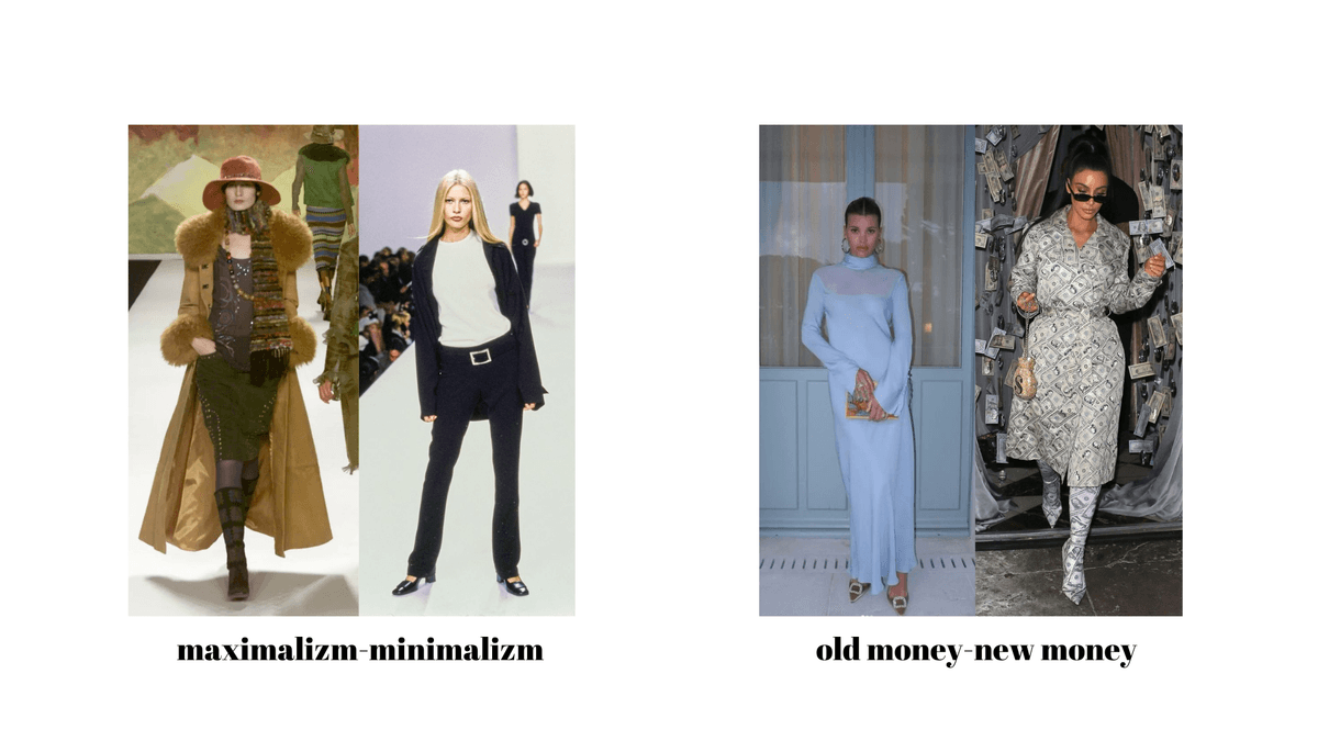 Aynı şekilde minimalizm- maximalism, old money- new money gibi akımlar tam tersi olan stillerin sınırlarını ilham alarak kendilerine bir sınırsızlık çizmişlerdir ya da kendi aykırı sınırlarını oluşturmuşlardır.
