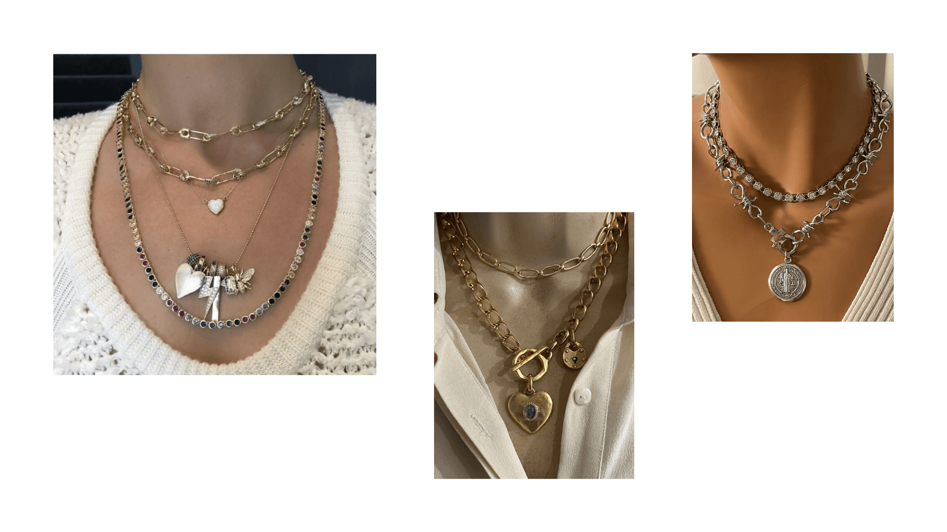 Takıları kombinlerken en küçük kolyeyi baz alıyoruz. Çünkü dikkat hep en üst kolyededir. Burada da zincirler ve tasmalar öne çıkıyor. Büyük ya da küçük zincirler; renkli, ışıltılı ya da sade ama ben buradayım diyen tasmalar…