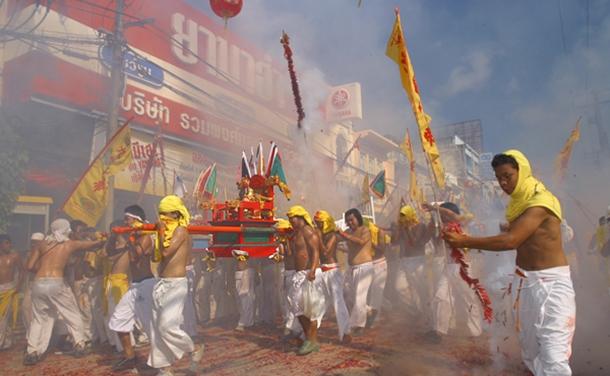 Tayland’da her yıl “Vejetaryen Festivali” düzenlenmektedir. Bu festival uzun bir tarihi sürece sahiptir. Festival, yalnızca vejetaryen diyeti ile ilgili değildir. Festivalin temeli Taoizm’e dayanır. İnsanlar kendilerini bu festival aracılığıyla tanrıya da kanıtlamaya çalışır. Bu sebepten yüzlerine büyük delikler açarlar. Yüzlerini deldikleri sırada acı hissetmediklerini iddia ederler. Çünkü tanrı o sırada onları ele geçirmiştir. Tanrıya bağlılıkları birde ateş üstünde çıplak ayak ile yürüyerek gösterirler. Bu şekilde kötülüklerinden ve günahlarından arındıklarını iddia ederler.