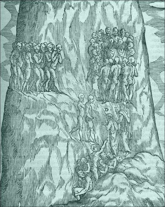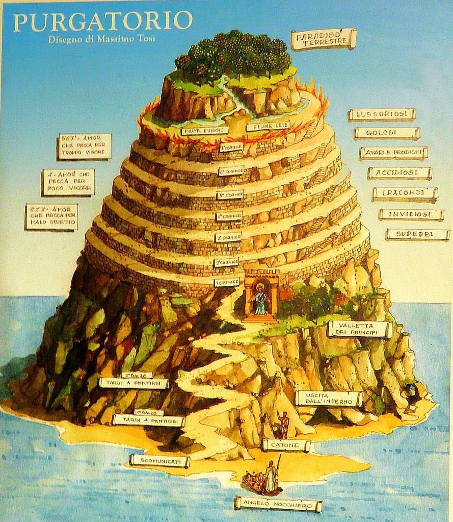 Unlike Inferno which is a spiral leading downwards, the Purgatory is a mountain which one should climb to reach salvation. According to Dante's narration, the Purgatory can be seen as a reflection of the peninent or ideal Christian life. While climbing, Dante discusses many things about sins, morality, ethics, politics, the church, vice, and virtues. He states that the source of all sins is love, either in abundance or in deficience. The Purgatory, which is located above Infero consists mainly of three parts, from bottom up these are: Ante-Purgatory, Purgatory Proper, and lastly The Earthly Paradise.