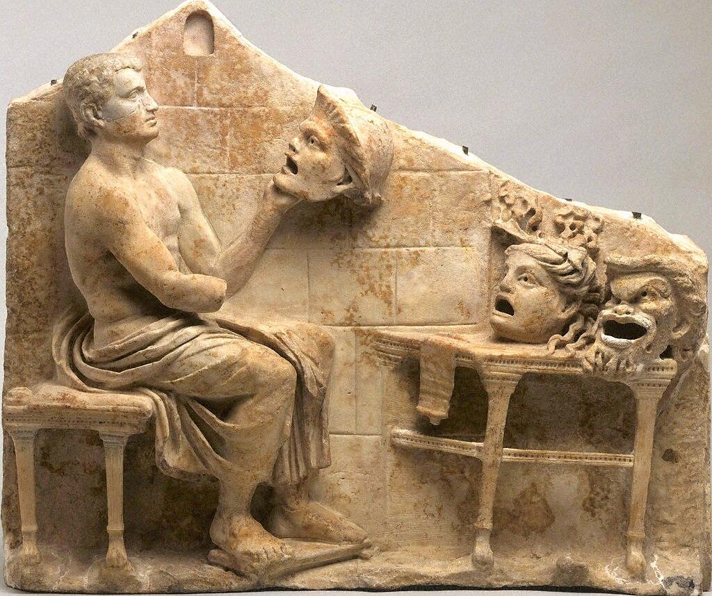 By Carole Raddato from FRANKFURT, Germany (FollowingHadrian); derivative work: Speravir - Mosaic depicting theatrical masks of Tragedy and Comedy, 2nd century AD, from Rome Thermae Decianae (?), Palazzo Nuovo, Capitoline Museums (12830396085).jpg, Public Domain, https://commons.wikimedia.org/w/index.php?curid=49867373