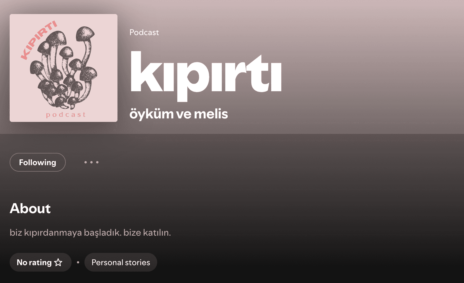 Öyküm ve Melis'in belirli konular, kitaplar üzerine konuştuğu yeni başlamış bir podcast serisi "Kıpırtı". Henüz 3 kayıtları var, en kısa kayıtları yaklaşık 34 dakika. Onları dinlerken zaman akıp gidiyor. Kıpırtı, iki yakın arkadaşın bir şeyler üretme ihtiyacı ve farklı ülkelerdeyken zoom uygulaması üzerinden konuştukları konuları kayıda taşıma kararı üzerine başlamış bir seri. Oldukça samimi, bilgilendirici ve içimizi ısıtan bir seri diyebilirim. En sevdiğim bölümleri ise şu oldu: https://open.spotify.com/episode/2w6CgYTsq9GtfWnWQQGngD?si=d5c85eb724bc4f76