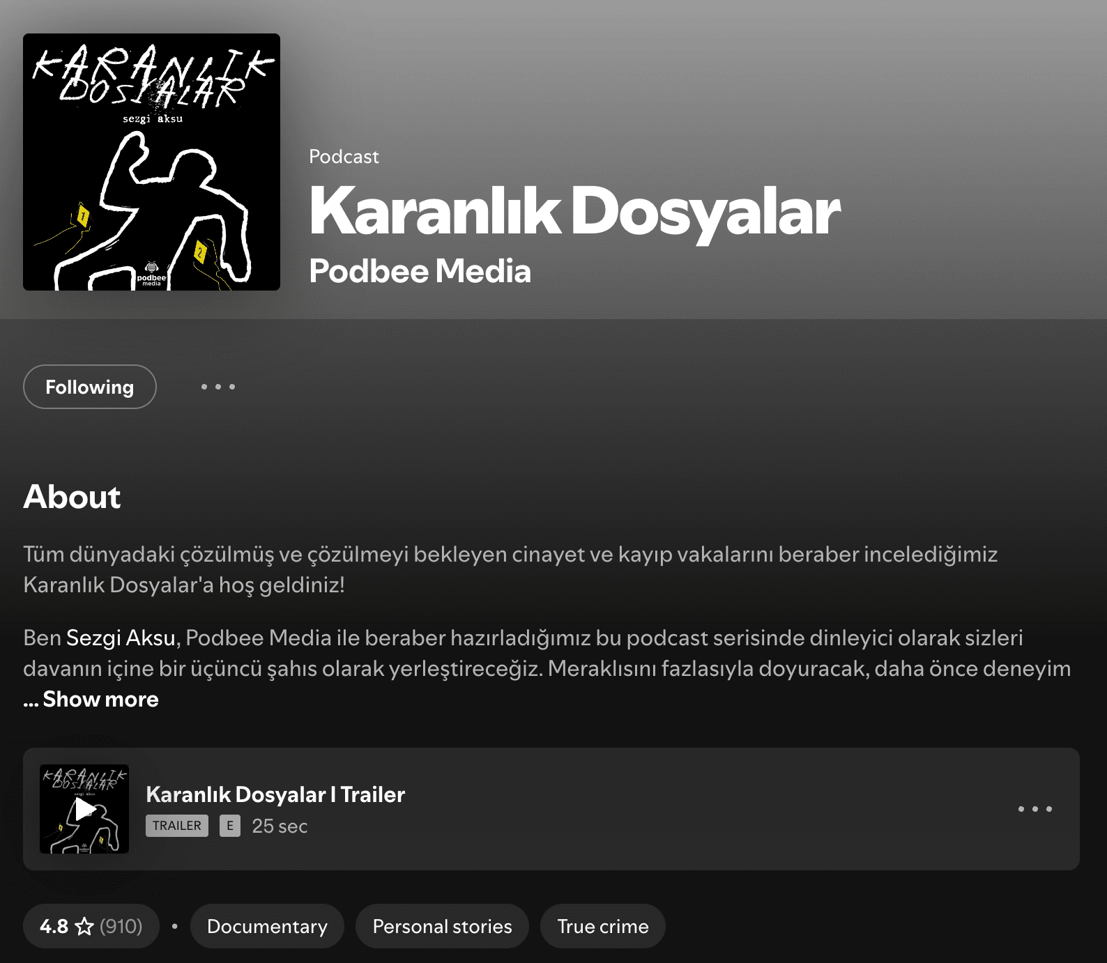 Mobil oyunlar oynarken (Bu ara Dr.driving'e ve Kafa Topu'na sardım.) katil biyografileri ve cinayet hikayeleri dinlemek hoşuma gidiyor. Kadın seri katillerle ilgili bir podcast -Kazıklı Maria'nın kadın seri katillerle ilgili güzel videoları var ama spotifya yüklememiş :(- ararken "Karanlık Dosyalar"ı buldum. Tesadüfen böyle kaliteli bir içerik bulmak beni çok mutlu etti. Seslendirmesi olsun, katillerin ağzından konuşmalar olsun her şey çok özenli ve kaliteli; dinlerken tüyleriniz diken diken oluyor. İlginizi çektiyse serinin en son bölümünü sizlerle paylaşıyorum: Kız Kıza Bir Gece - Jill Meagher: https://open.spotify.com/episode/3cNQzBLy1enuMeLTvITmVx?si=d6e3de6fd6a24d32