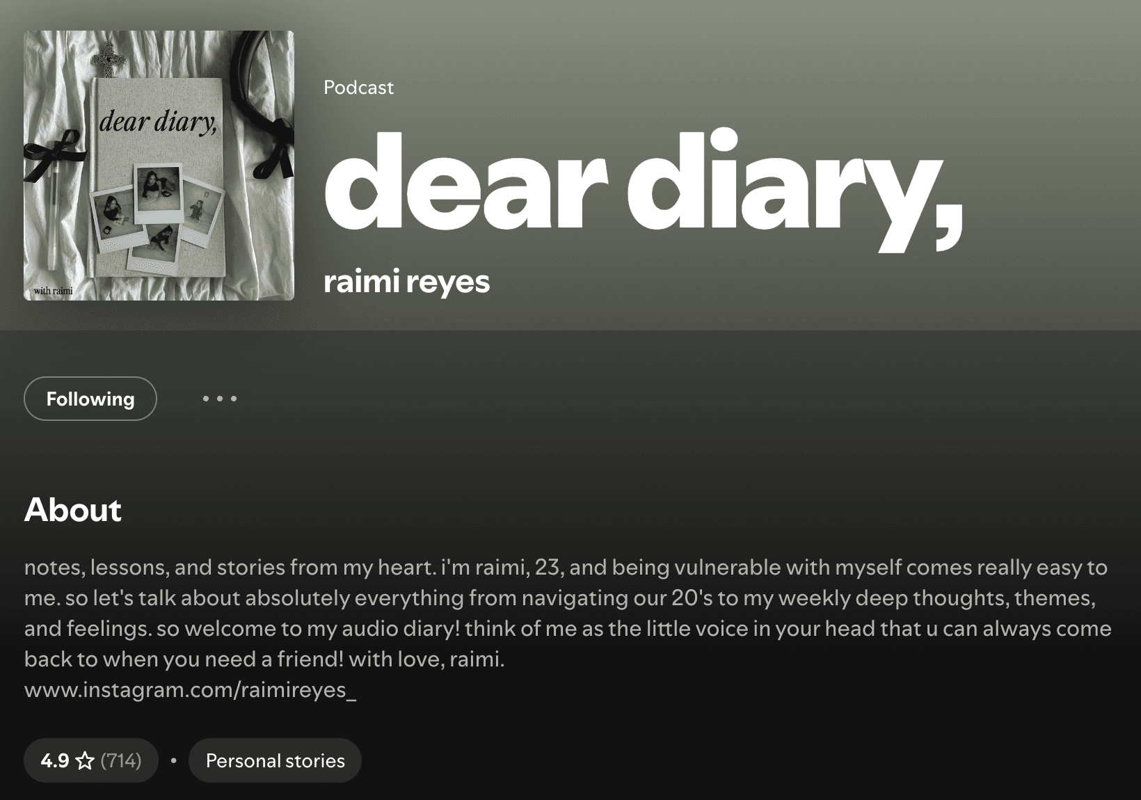 Son önerim ise "dear diary". Bu da ingilizce bir podcast serisi ama ben B1 ingilizcemle dinlemeye başlamıştım, o zaman bile gayet anlıyordum Raimi'yi. Tek başıma dışarı çıkmak, gezmek, en basitinden ucube gibi hissetmeden tek başıma kahve içebilmek istiyordum. Bunun üzerine self-date terimini öğrendim ve spotifyda şu karşıma çıktı: https://open.spotify.com/episode/2VF7pVEoP6qpdWWgBPnaVb?si=f06595a5f51948d7 Daha sonra sanki yakın arkadaşımmış gibi hissettiren bu hanımefendinin diğer podcastlerine göz attım ve oldukça hoşuma gitti. Lisenin son senesi benim için fazlasıyla zor geçiyordu ve Raimi'nin podcastlerini tekrar tekrar dinlemek beni anlayan arkadaşımla sohbet etmek gibiydi.