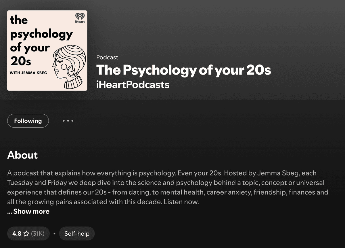 Psikolojiyle ilgilenenler, ingilizcesini geliştirmek isteyenler, İngilizce bilip ilgi çekici podcast bulamayanlar mutlaka bu seriye göz atsın. Sade bir dille her şeyin -açıklamasında yazdığı gibi- psikolojisini anlatıyor. Şu ana kadar 230 bölümü var. Kendimi yalnız hissettiğimde veya ingilizceye maruz kalmak istediğimde bu seriden rastgele bir bölüm açıp dinliyorum. Anksiyeteden ilişkilere, kişisel gelişimden basit şeylerin psikolojisine... Aradığınız her şeyi bulabilirsiniz. Benim en çok ilgimi çeken bölüm şu olmuştu: https://open.spotify.com/episode/24bjyRR2m2gbXK7Uy6RbVo?si=3d5e60ae5e5e4aef