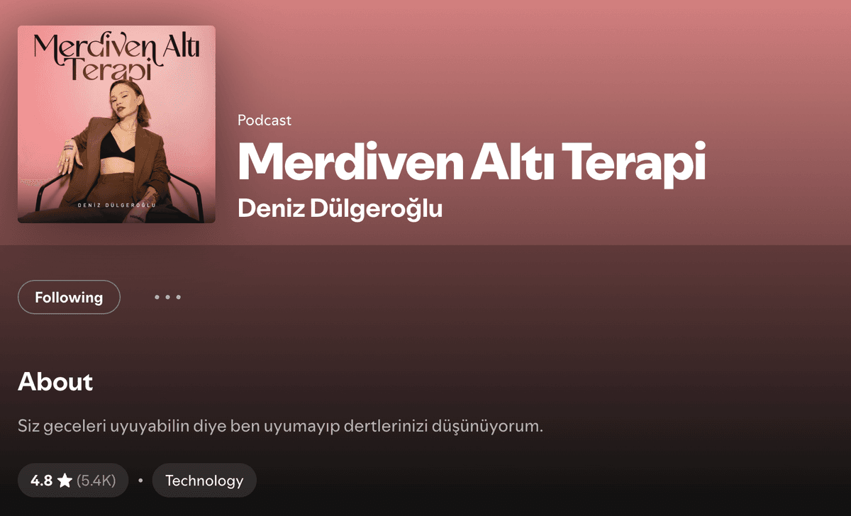 Merdiven Altı Terapi, dertlerime derman olmaya çalışan bir podcast. Bu bilinen bir seri olsa da podcast dinlemeye yeni başlayanlara önermek istedim. Deniz Dülgeroğlu -kendisi aynı zamanda influencer ama ben podcastlerle tanıdım onu- anladığım kadarıyla bilinen birisiymiş zaten. Influencer olmadan önce de belli bir camiada tanınıyormuş yani. Kendisi yaşam tecrübelerinden, travmalarından ve gittiği terapilerden bahsediyor. Böyle sıkıcıymış gibi anlattığıma bakmayın, fazlasıyla farkındalık arttırıcı podcastleri var kendisinin. Mesela bir olay örgüsünü anlatırken takıldığı küçük detaylar sayesinde ben de hayatımdaki küçük detayları fark eder oldum. Instagram hikayelerini izleyince "Vay be ne kusursuz bir hayatı varmış." diyorum sonra dönüp podcastlerini dinliyorum ve şu an kusursuz görünen hayata kavuşmak için nasıl çabaladığını görüyorum. Bu hanımefendiye ayrı bir sempatim var çünkü kendisi seksle ilgili açık açık konuştuğundan ve kadın bir girişimci tarafından işletilen bir "seks shop"un sponsorluğunu aldığından dolayı bir dönem bayağı linçlenmişti. Ama ben onun açık sözlülüğüne bayılıyorum. Yalnız olmadığımı hissettiren birçok podcasti var ama beni en derinden etkileyen bölümü şu olmuştu: https://open.spotify.com/episode/3htAWswd5tcXlc7fwjesrc?si=3edd25e76e554f13
