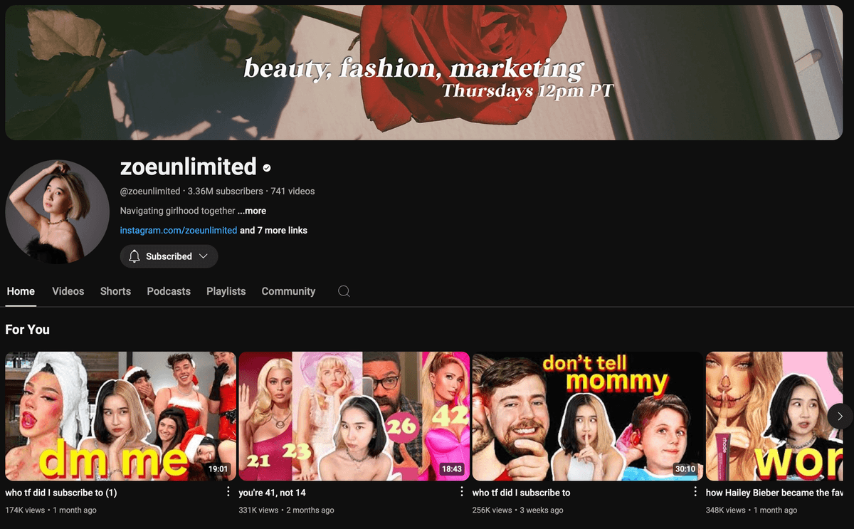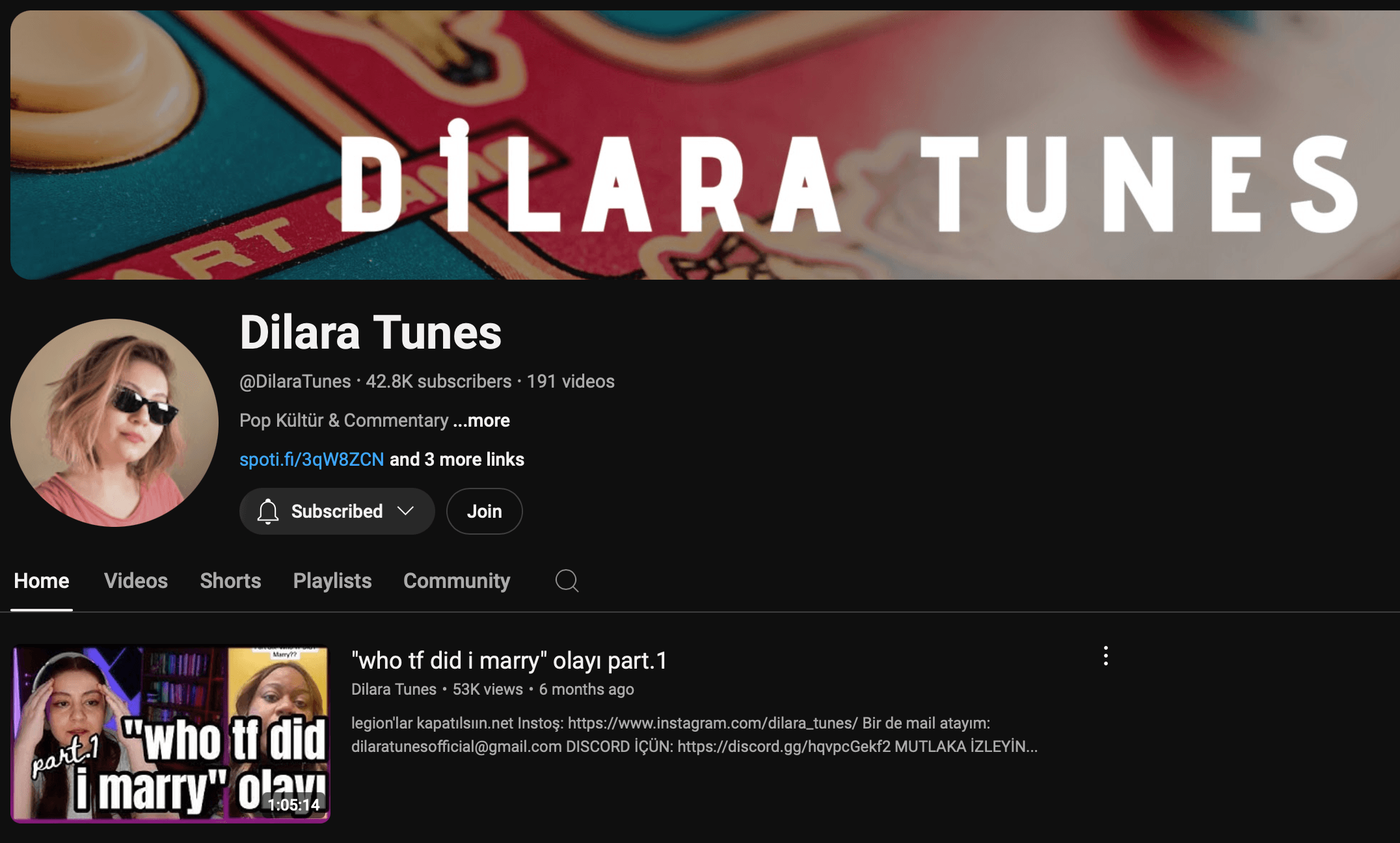 Dilara Tunes da bir tepki kanalı diyebilirim. Okuduğu kitaplar hakkında konuşuyor, yaşadığı olayları anlatıyor ve ilginç bulduğu olayları yorumluyor. Aynı zamanda medya okuryazarlığına heveslendiriyor diyebilirim, çoğu videosunda denk geldim; medya okuryazarlığının ne kadar önemli olduğundan ve herkesin biraz da olsa bilmesi gerektiğinden bahsediyordu. Ek olarak kendisinin "Lilo TV" ve "Milo TV" diye iki farklı kanalı daha var.
