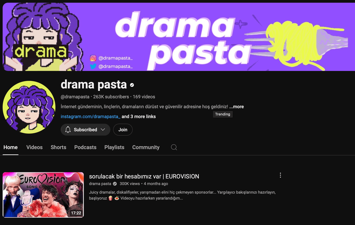 Drama pasta; gündemdeki olayları, magazin haberlerini, çok konuşulan skandalları ve ünlülerin kariyerlerini inceleyen videolar çekiyor. Magazini ondan dinlemek oldukça keyifli ve meraklandırıcı, kendimi hiç merak etmediğim bir olayı pür dikkat dinlerken bulabiliyorum. Mutlaka bir göz atın!