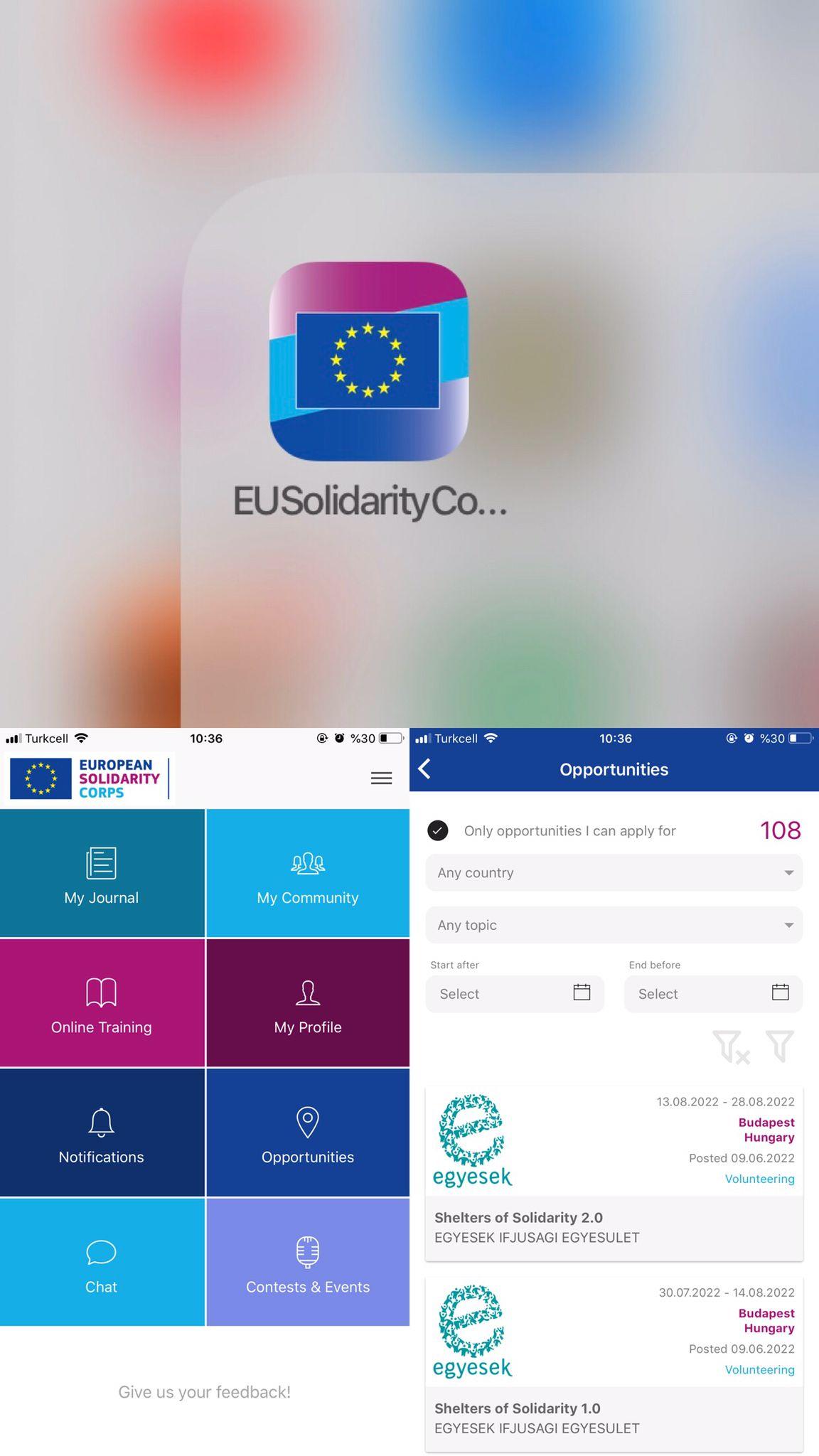-ESC portalına giriş yapmalı ve kendinize ait bir profil oluşturarak ilgilendiğiniz projeleri bularak başvuru yapmalsınız.(Portalı application olarak bile indirip giriş yapabilirsiniz.) Görsellerde portalın portala giriş yaptığınızda açılacak sayfanın ve fırsatlardan da bulabileceğiniz projelerin görsellerini paylaştım.