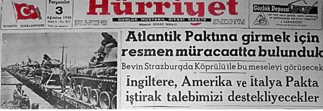 II.Dünya Savaşı sonrası yayılmacı politika izleyen Sovyetler Birliği ve yaygınlaşan sosyalist hareketlere karşı 1949 yılında 30 ülke katılımıyla Kuzey Atlantik Paktı Teşkilatı yani NATO kurulmuştur. Türkiye NATO'ya ilk başvurusunu 1950 yılında CHP iktidardayken yapmıştır fakat başvurusu olumsuz sonuçlanmıştır. Olumsuz sonuçlanmasının nedeni Türkiye'nin Kuzey Atlantik Bölgesinde olmaması gösterilmiştir. Başvurunun hemen sonrasında Kore Savaşı patlak vermiştir. Seçimi kazanarak iktidar olan Demokrat Parti zamanında Türkiye, Kore'ye asker göndermeye karar vererek Türkiye'nin NATO'ya girmesi adına önemli adımı atmış ve sonrasında NATO'ya girmek için tekrar harekete geçmiştir. Kore'ye asker gönderen Türkiye'nin NATO için önemli bir müttefik olabileceği anlaşılmış ve Sovyetler Birliği'ne karşı da Türkiye'nin jeopolitik konumunun önemli olduğu kanısına varılmıştır. Türkiye'nin yaptığı bu hamle sonrasında 1952'de resmi olarak NATO'ya üyeliği başlamıştır.
