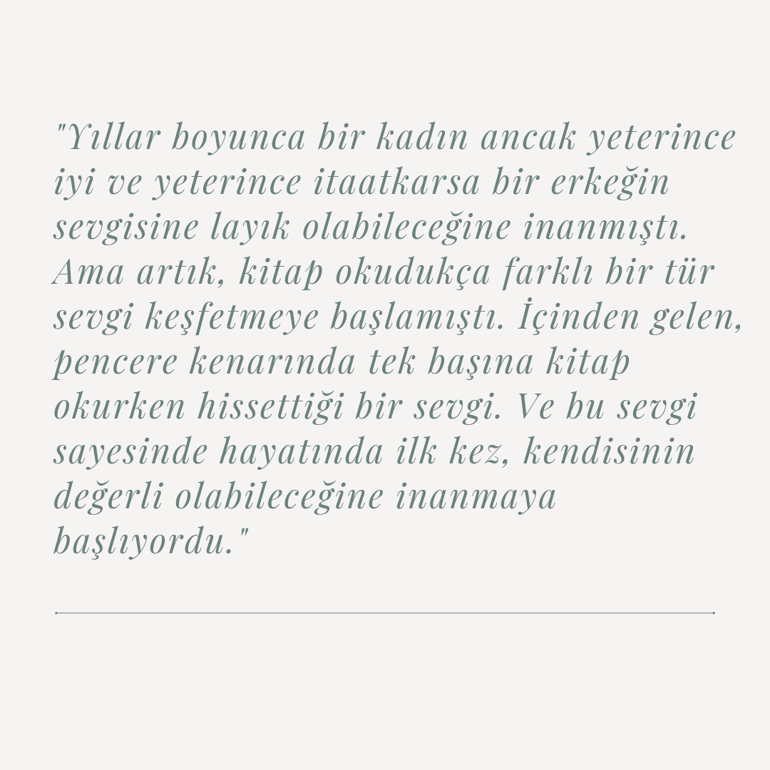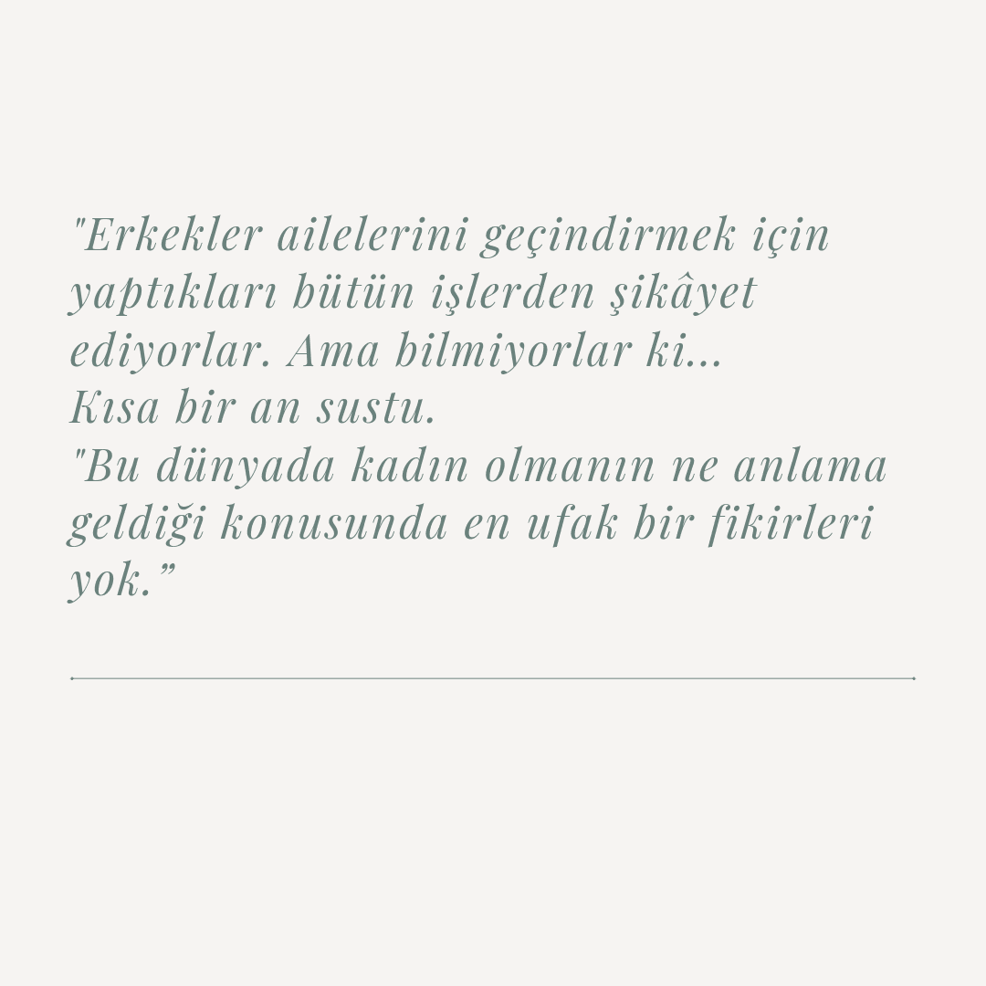 Hayal etmek yasak, okumak yasak hatta yolda yürümeniz bile yasak, hayatlarınızın bir erkeğe bağlı olması. Sevmediğin bir erkekle evlenmek zorunda, çocuk doğurmak ve hizmet için kullanılan kadınlar. Kİtap insanı derinden sarsıyor. Bu sistemler baş kaldıran kadınların olduğunu Etaf Rum bizde sunuyor. Kitabı kadının okumasını gücüyle savunuyorum. Bu kadınların sesi olmalıyız. parçaları susturmak değil bunların sesi olmalıyız. Bilinçlenmek için kitabı okuyun ve okuyun. Bu sadece bir roman, kurgu değil bu kitap gerçek. Bunu yaparken insanı derinden sarsıyor. Bu kadınların sesi olan, burada okutan Etaf Rum'a teşekkür ederim.