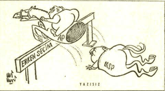 We can see that by looking caricature at above, Erbakan (leader of MSP) tried to change the idea of Demirel and prevent early elections. However, with CHP's support the majority of the assembly was sustained and the decision of early election took. Therefore, Turkey went to the general election on 5 June 1977 (Sevdi 2018).