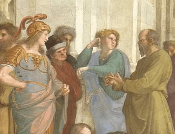 Platon'un sağında yer alan Sokrates, batı felsefesinin babası olarak kabul edilir. Aynı zamanda Platon'un da hocasıdır. Ardında yazılı eser bırakmayan Sokrates'in düşünce şekli ve kişiliğini, Platon'un yazdığı "Sokrates'in Savunması" isimli eserden öğrenebilmekteyiz. İnatçı, bildiği doğrulardan vazgeçmeyen bir insan olarak bildiğimiz filozof, eserde de kararlı bir şekilde çevresine anlatım yapar vaziyette çizilmiştir.