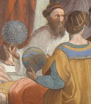 Yaşadığı dönemde coğrafya ile uğraşan bilim adamı Batlamyus ve astronomi ile uğraşan Zerdüşt, ellerinde gökküre ve yerküre ile resme dahil edilmiştir.