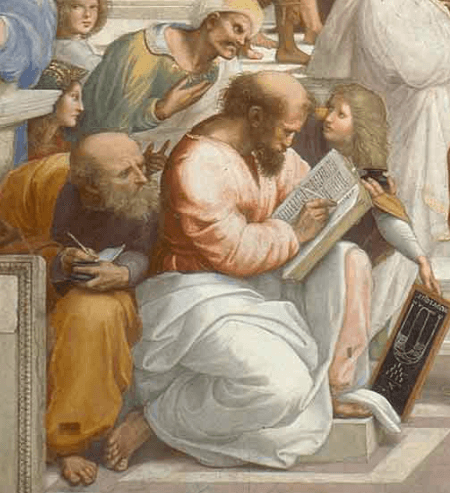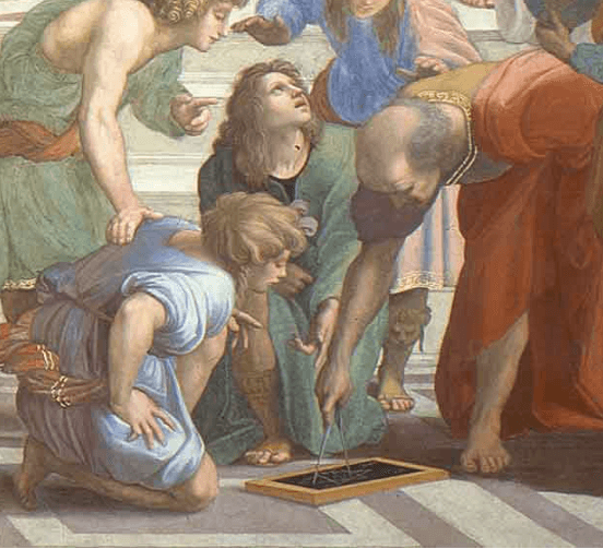 Pisagor'un bulunduğu köşenin karşına konumlandırılan Öklid, geometrinin babası olarak anılmaktadır. Resimde ise çevresindeki kişilere anlatım yaparken gösterilmiştir.
