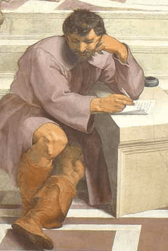 Freskteki kalabalıktan ve gruplardan uzak iki figürden biri olan Heraklitos, aslında yaşadığı devirde de toplumdan uzak yaşamayı tercih etmiştir.