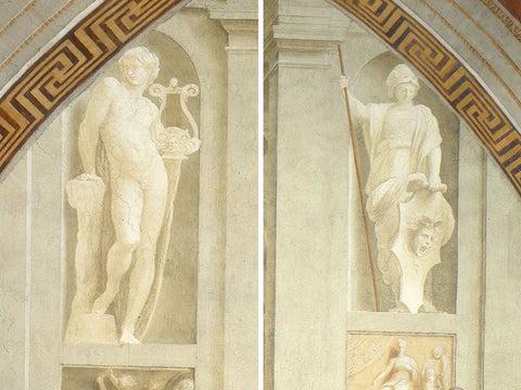 Resmedilen eserin bağlamı olan mimari yapıda yer alan nişlerde, Yunan tanrılarının yer aldığını görmekteyiz. Apollon, müziğin ve güzel sanatların tanrısı; Athena ise aklın ve stratejinin tanrıçası olarak bilinir. Konumları itibariyle Apollon edebiyat temalı fresk olan Disputa'ya; Athena adaletin sembolize edildiği esere yakın çizilmiştir.