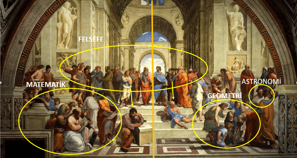 Freskin merkezinde yer alan iki figürün Aristo ve Platon'a ait olduğu çok açık. Figürler birbirleriyle konuşarak yürürken resmedilmiştir. Bu esnada Platon "Timeos"u, Aristoteles ise "Ethica"yı elinde tutmaktadır. Vücut hareketlerine baktığımızda ise kişilerin bu duruş pozisyonlarının gelişigüzel seçildiği söylenemez. Eliyle yukarıyı göstermekte olan Platon (idealizm) ve ona karşıt olarak yeri gösteren Aristoteles (realizm) sembolik olarak kendi felsefelerini belirtmektedir.