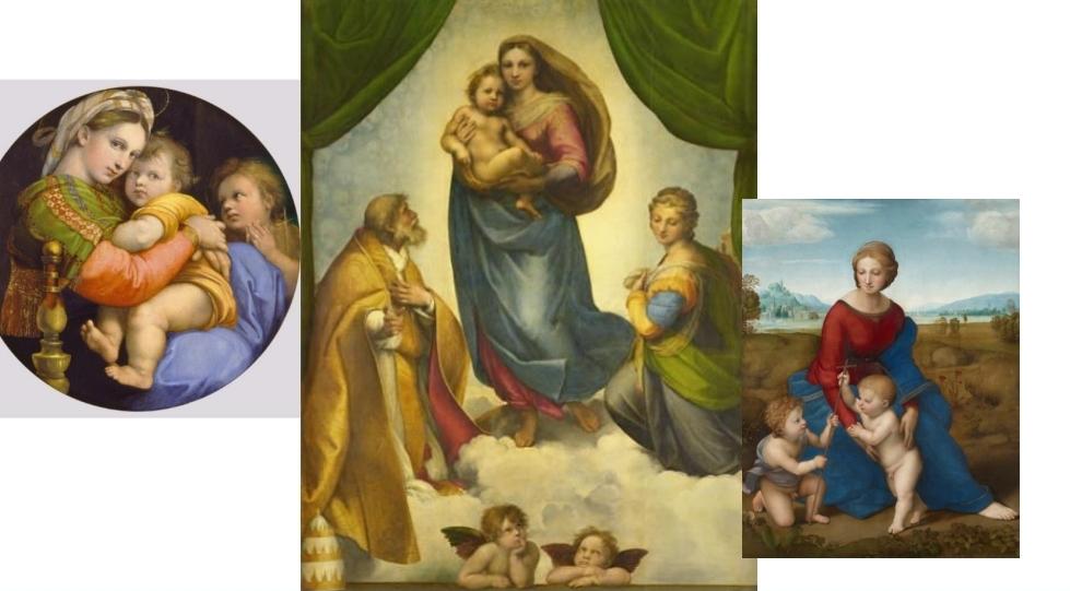 Raffaello'nun diğer gözde eserleri; dini içeriklere sahip olan Madonna della Seggiola, Çayırlık Meryemi, Sistine Madonnası'dır. Bu eserlerinde çağdaşı Leonardo da Vinci'nin etkisi gözle görülür bir şekilde anlaşılmaktadır.
