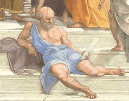 Sade ve doğal bir yaşam tarzı seçmiş filozof; resimde de tek başına, rahat bir poziyonda oturan ve etrafında olup bitenlerle ilgilenmeyen bir figür olarak resmedilmiştir. Giymiş olduğu kumaşların renklerinin, Aristo ve Platon'un ikisinin kıyafetlerinde kullanılan renklerden seçilmiş olması bilinçli bir tercih olabilir.
