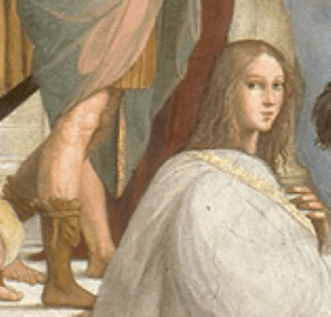 Bu figür, Papalık Odası'nda bulunan Atina Okulu freskinde resmedilmiş tek kadın olarak, kendisine yapılanların ardından, kararlı ve kendinden emin bir şekilde izleyicisinin gözünün içine bakmaktadır.