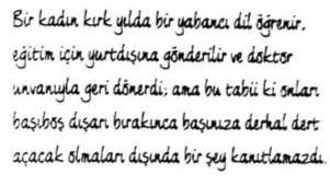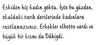 “Kadınların ortaya çıkışından bu yana bilinen tek kadın bilim insanı Marie Curie'dir. Çünkü kızların bilimsel bir alanda eğitim almasına izin verilmiyordu; üreme organları onları mantıksız kılıyordu, üstelik soyut düşüncenin perde asmaya bir faydası yoktu. Ama börtü böcek toplamalarına izin vardı, ne de olsa bunu kendi bahçelerinde yapabilirlerdi.”