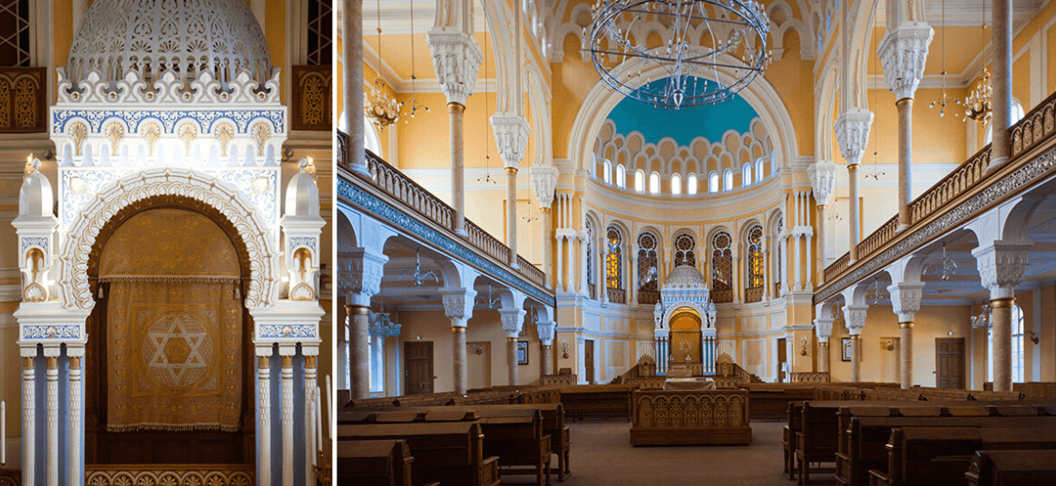 İç mekan da aynı derecede etkileyicidir. Sinagogun ortasında, Aron Kodesh adı verilen ve yedi Tora mezrası içeren kutsal sandık öne çıkar. Sinagog, 1.200 kişilik devasa bir dua salonuna sahiptir ve bu büyüklük, onu Rusya'daki en büyük, Avrupa'daki ise ikinci en büyük sinagog yapmaktadır.
