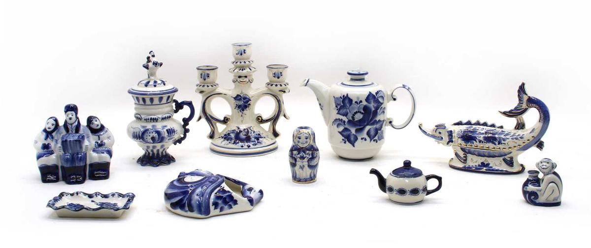 Gzhel denince akla gelen ilk şey, beyaz porselen üzerinde parlayan parlak mavi desenlerdir. Bu mavi desenler, Gzhel porseleninin en belirgin özelliğidir. Gzhel bölgesindeki zanaatkarlar, porselen heykellerden ve figürinlerden kutulara, vazolara, şamdanlara, kül tablalarına ve saatlere kadar geniş bir yelpazede kullanışlı ve dekoratif ürünler üretirler.