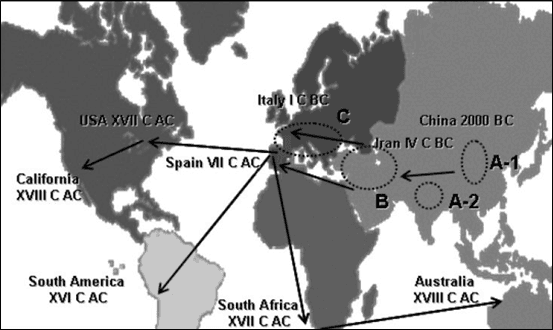 Harita 1: Kayısının Kökeni (A-1 ve A2 sırasıyla Çin ve Keşmir’deki Birinci Gen Merkezi; B Türkiye, İran ve Kafkasya’yı içeren İkinci Gen Merkezi; C Avrupa, Üçüncü Gen Merkezi) (Kaynak: Altan, 2019)