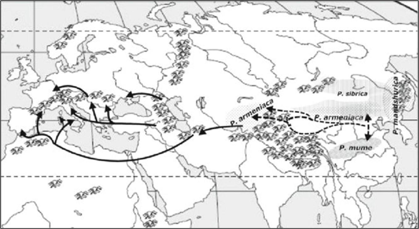 Bugün Sibirya’nın çok soğuk, Kuzey Afrika’nın subtropik, Orta Asya’nın çöl, Japonya ve Doğu Çin’in ise nemli alanlarında yetiştirilen birçok kayısı çeşidi bulunmaktadır. Doğu Türkistan, Orta Asya ve Batı Çin'i içerisine alan çok geniş bir bölgenin kayısının ana vatanı olduğu kabul edilmektedir. Günümüzden 5000 yıl gibi çok uzun bir zaman önce kayısının bu bölgede yer aldığı ve yetiştiriciliğinin yapıldığı bilinmektedir. Büyük İskender'in Asya seferleri sırasında kayısı M.Ö. IV. yüzyılda Anadolu’ya getirilmiş (Harita 1), yetişmesi için uygun ekolojiye sahip Anadolu ise ikinci vatanı olmuştur.