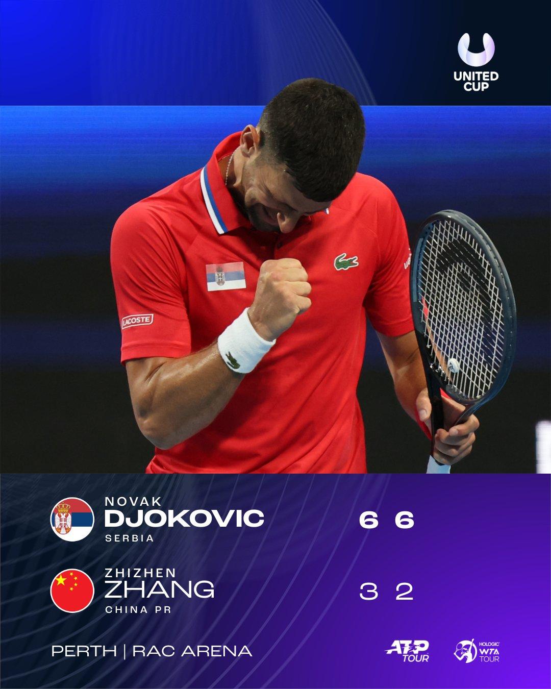 2023 yılının son maçlarına gelecek olursak ATP Sıralamasında Dünya 1 numarası olan Novak Djokovic, Zhizhen Zhang'ı 6-3, 6-2 ile geçerek Perth'te Sırbistan'ı 1-0 öne geçirdi. Zhang iyi servis atıyor olmasına rağmen Djokovic yedi kez servis kırma puanı elde etti ve üçünü değerlendirdi. Bunun yanı sıra kritik anlarda kullandığı etkili servisleri Djokovic’in galibiyetindeki en büyük etkendi. Maçın ardından Djokovic, "Yeni yıla birkaç saat kaldı. Bu yüzden yeni yılı bizimle birlikte burada kortta kutlamaya geldiğiniz için gerçekten minnettarım. Perth'e gelmeyeli 10 yıl oldu. Bu arena oynadığım en güzel arenalardan biri.” dedi.