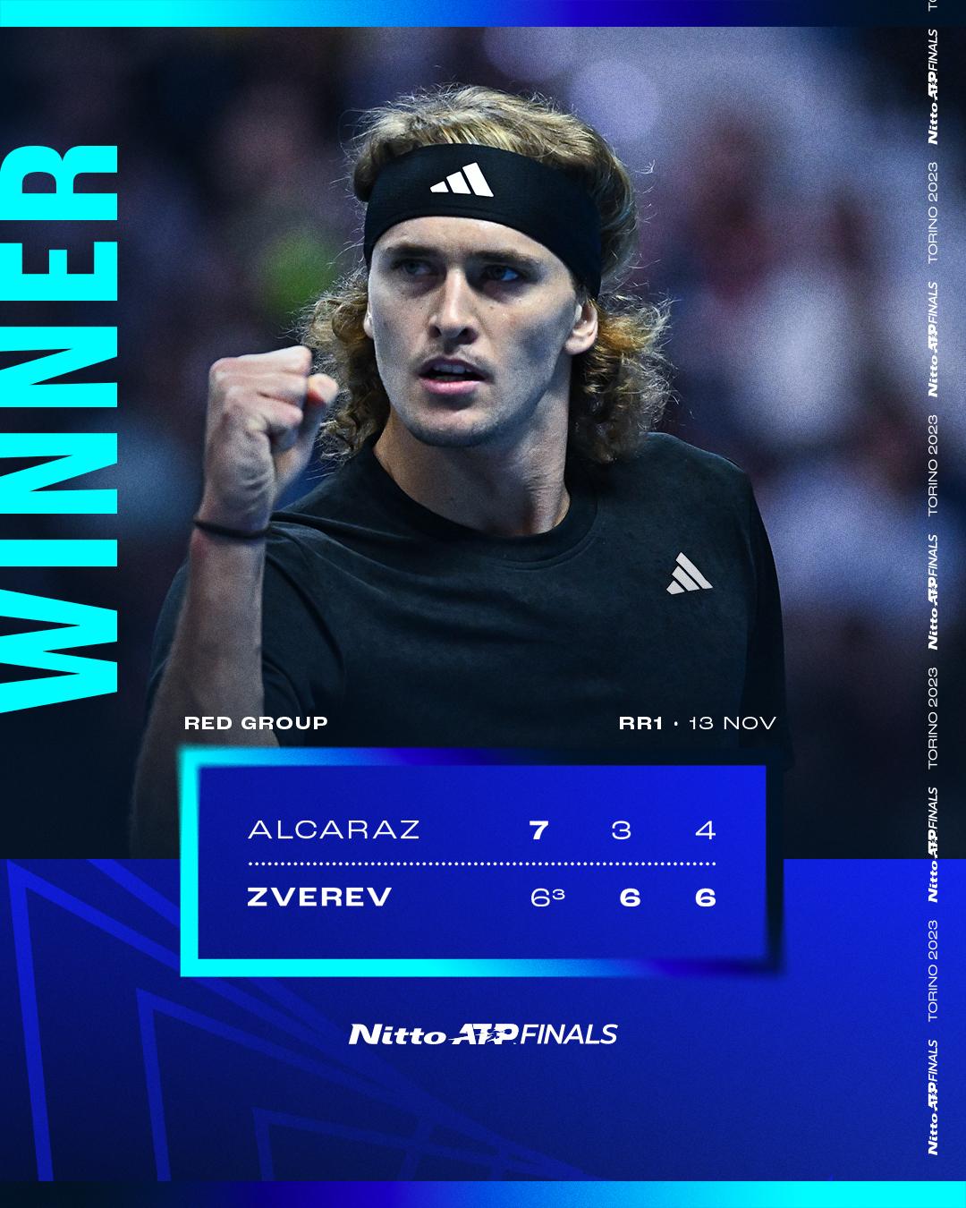 Günün ikinci maçında, geçtiğimiz yıllarda iki kez ATP Finalleri şampiyonluğu alan yedi numaralı seribaşı Alexander Zverev, iki numaralı seribaşı İspanyol Carlos Alcaraz’ı 6-7(3), 6-3, 6-4 yenerek grup maçlarına galibiyetle başladı.