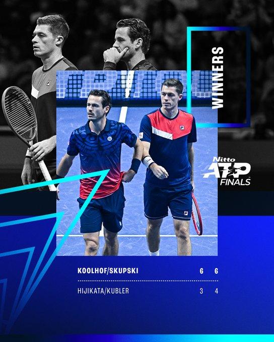 Pazartesi günü oynanan maçta çiftlerde turnuvanın iki numaralı seribaşları Wesley Koolhof ve Neal Skupski, Avustralyalı rakipleri Rinky Hijikata ve Jason Kubler’i 6-3 ve 6-4 ile geçti. Oldukça yüksek bir servis kazanma yüzdesiyle oynayan ve file önünde kusursuza yakın bir performans sergileyen Koolhof / Skupski çifti, Wimbledon’ın ardından bu yılki üçüncü kupalarını kovalıyor. Avustralya Açık şampiyonluğu sonrası yılı sönük geçiren Hijikata / Kubler çifti ise ilk kez sezon sonu finallerinde boy gösteriyor.