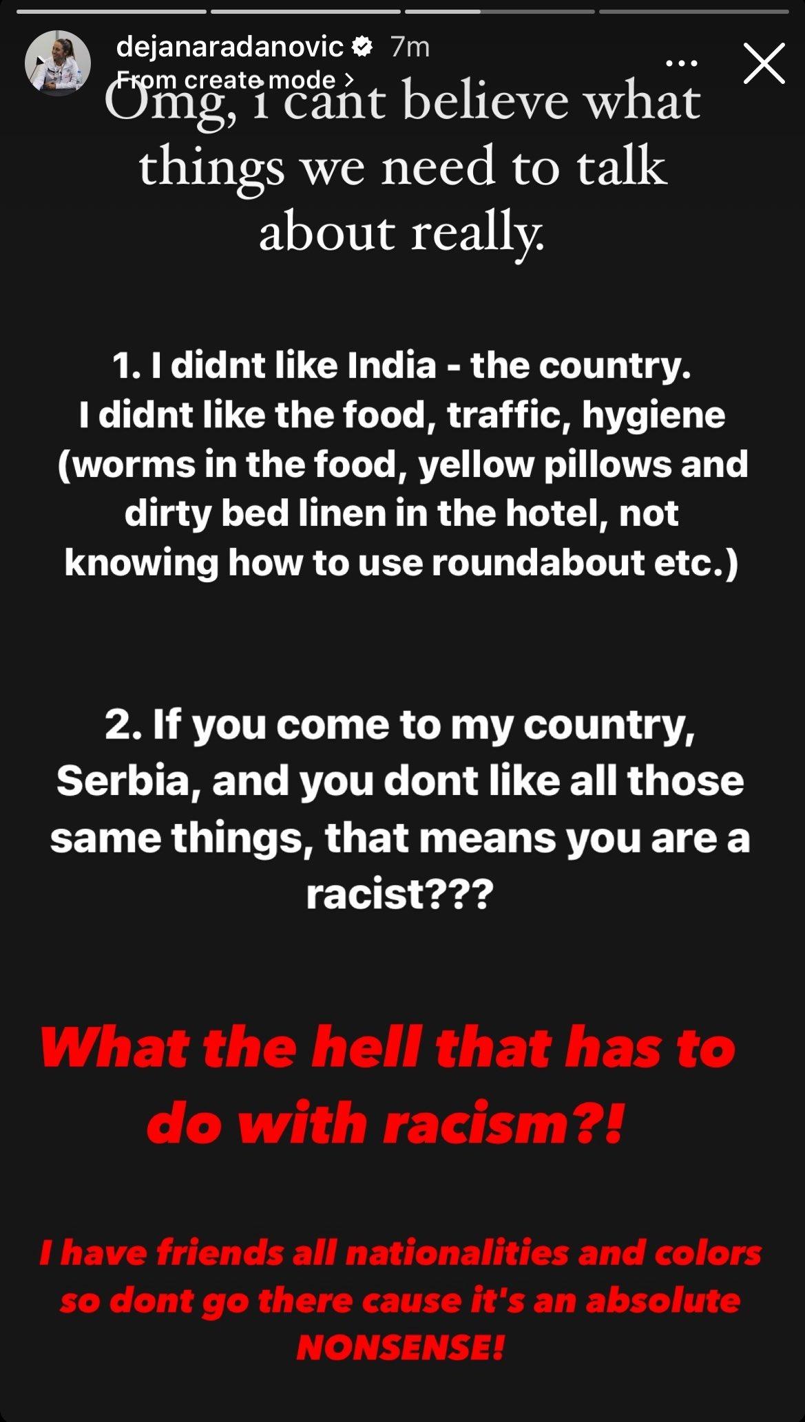 Bu Instagram hikâyeleri, onu ırkçı olmakla suçlayan insanlardan çok fazla tepki aldı ve birçok kişi tenisçinin sosyal medyadaki ifadeleri için bir özür yayınlamasını talep etti. Radanovic paylaştığı başka bir hikâyede ırkçılık suçlamalarının saçmalık olduğuna dair açıklama yaptı. Yorumlarının Hindistan’da yaşayan insanlarla ilgili olmadığını söyledi. Radanovic, Hindistan'daki yemekleri, trafiği ve hijyeni beğenmediğini belirtti.
