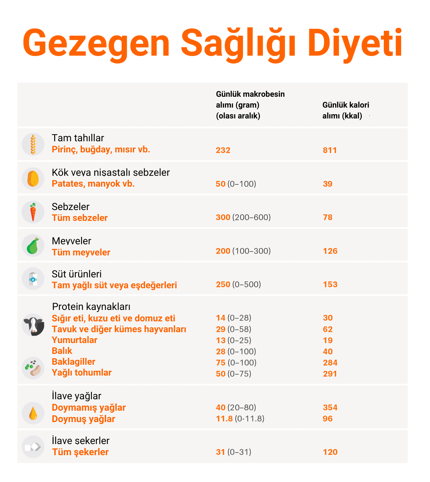 2500 kkal/gün alımına sahip bir bireyin gezegen diyetine göre tüketmesi gereken besinlerin bilimsel olarak tahmini miktarları aşağıdaki tabloda verilmiştir: