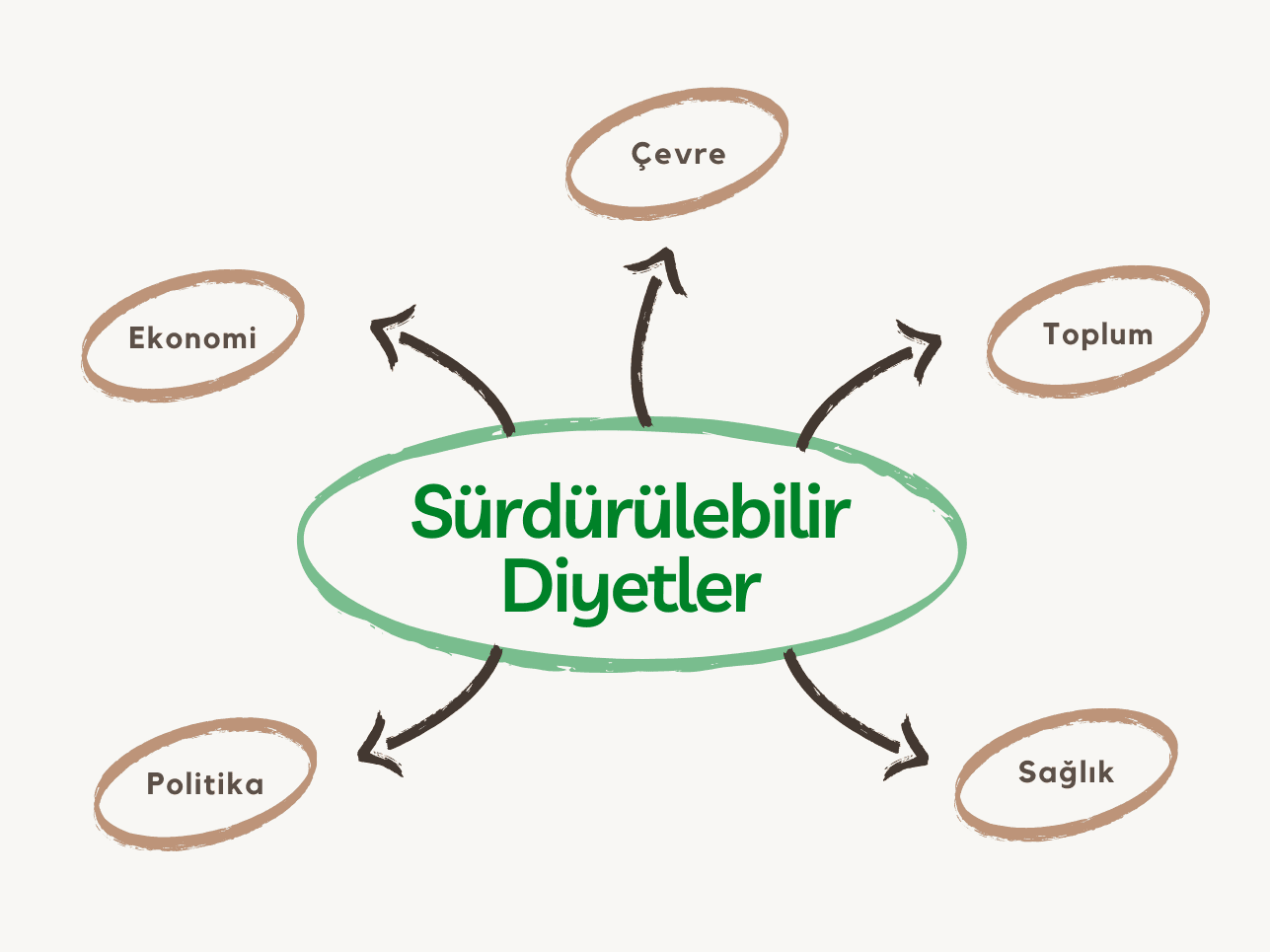 Sürdürülebilir diyetler beş boyut etrafında düzenlenmiştir: