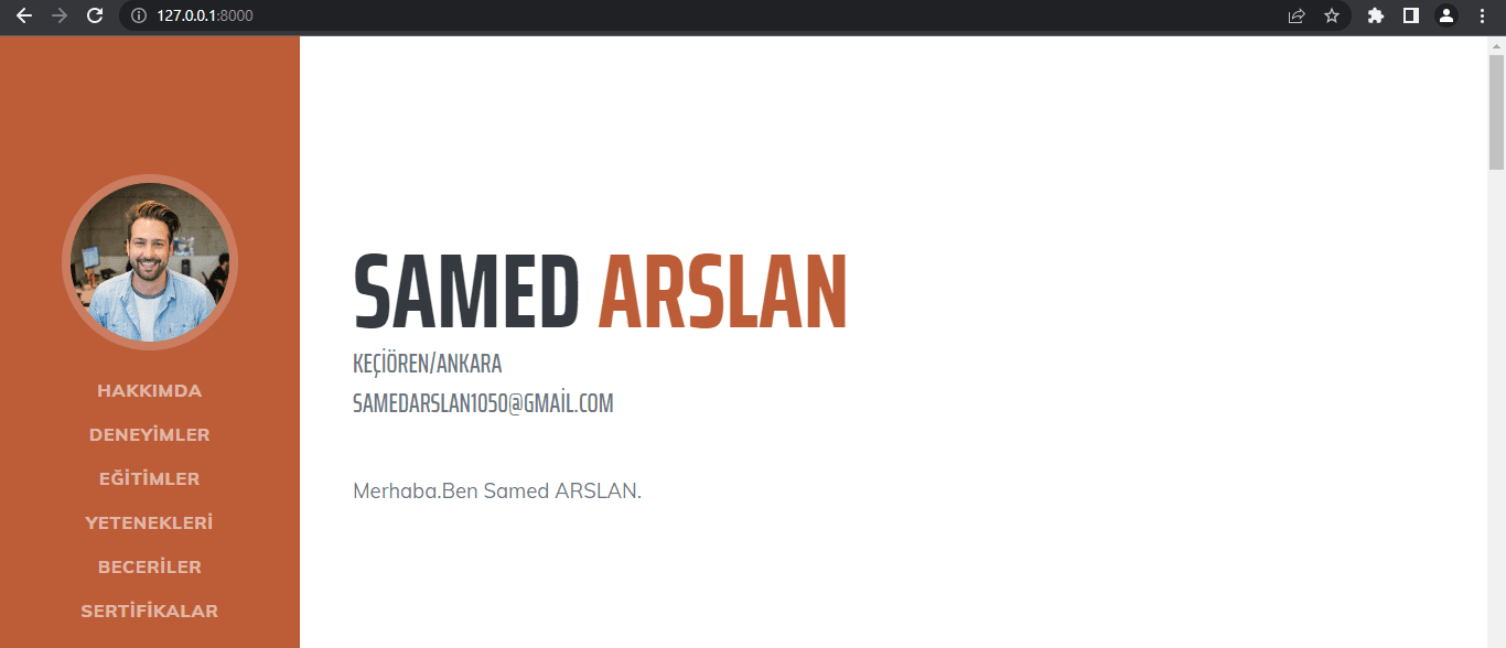Web sitem cv tarzında tasarlandı. Görselde, hakkımda sayfası bulunmaktadır. Fark edildiği gibi hakkımda, deneyimler, eğitim, yetenekler, beceriler, sertifikalar gibi alanlar turuncu menüde yer almaktadır. Bu alanların hepsi farklı bir sayfayı temsil ettiği için web sitesini parçalayarak kontrol altına almamız gerekir. Böylece düzeni sağlamış oluruz.