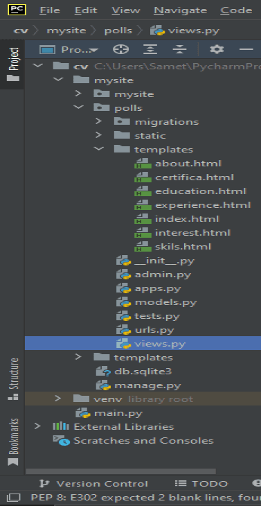 - templates: Web sitemizi parçaladıktan sonra html uzantılı sayfaların barındırılacağı klasördür. Mysite içerisindeki templates ile karıştırılmamalıdır.