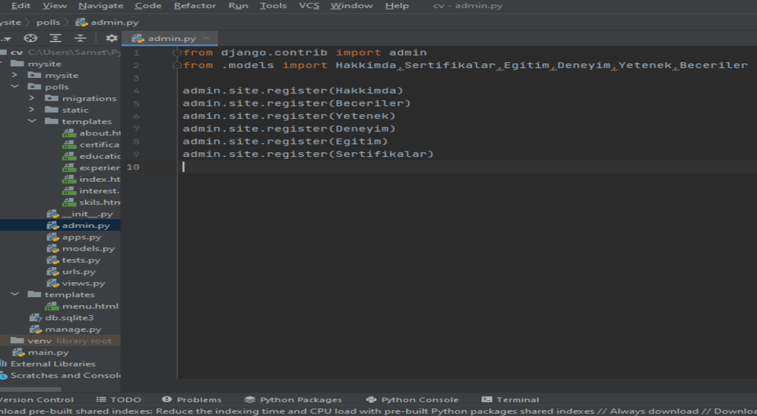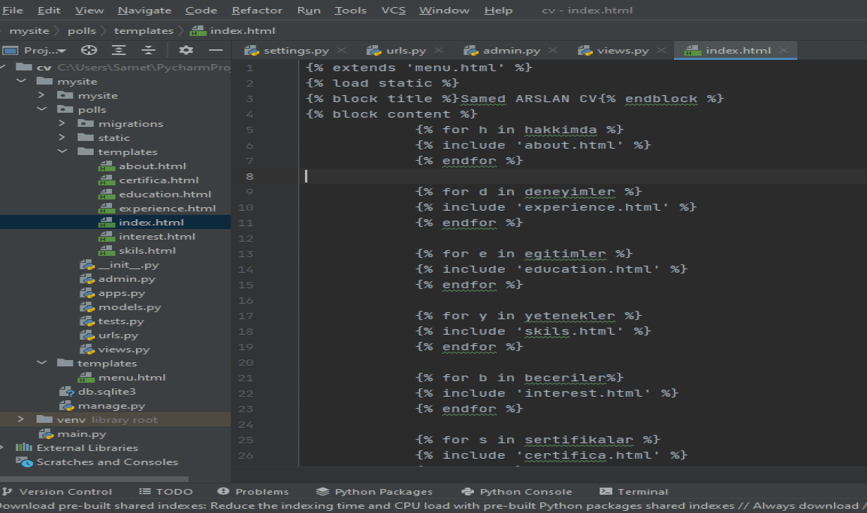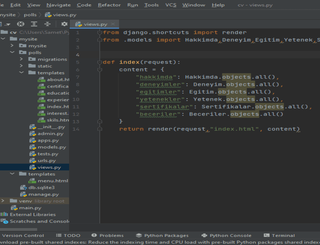 Views.py sayfası M.V.T yapısının en kritik noktasıdır. Başlangıç seviyesinde proje olduğu için çok kısa bir kodlama çalışması gerçekleştirdim. Ancak sayfalar arası geçişlerin dinamik olduğu sitelerde birden fazla fonksiyon kullanılmaktadır. Benim cv sitem url bağlantıları içermediği için, statik olduğu için tek fonksiyon altında topladım. Django shortscuts kütüphanesinden render methodunu import ediyoruz. Çünkü, render() metodu ilk parametre olarak uygulamaya yapılan request nesnesini ilk parametre olarak alması gerekiyor. İkinci parametre olarak ise döndürülecek html sayfasının ismini alır. Ardından models veri tabanı sayfamızı views sayfamıza dahil ediyoruz. Models.py içerisindeki Hakkımda, Deneyim, Egitim, Yetenek gibi classları views sayfamıza taşıyoruz. Son olarak index fonksiyonuna hepsini kodluyoruz. Böylece; objects.all() komutuyla veri tabanındaki verileri, index.html sayfasına yönlendiriyoruz. İndex.html sayfasında bulunan ilgili sayfalara ilgili verileri {% for .. in .. %} komutları sayesinde gönderiyoruz(index.html sayfası bir üstte).