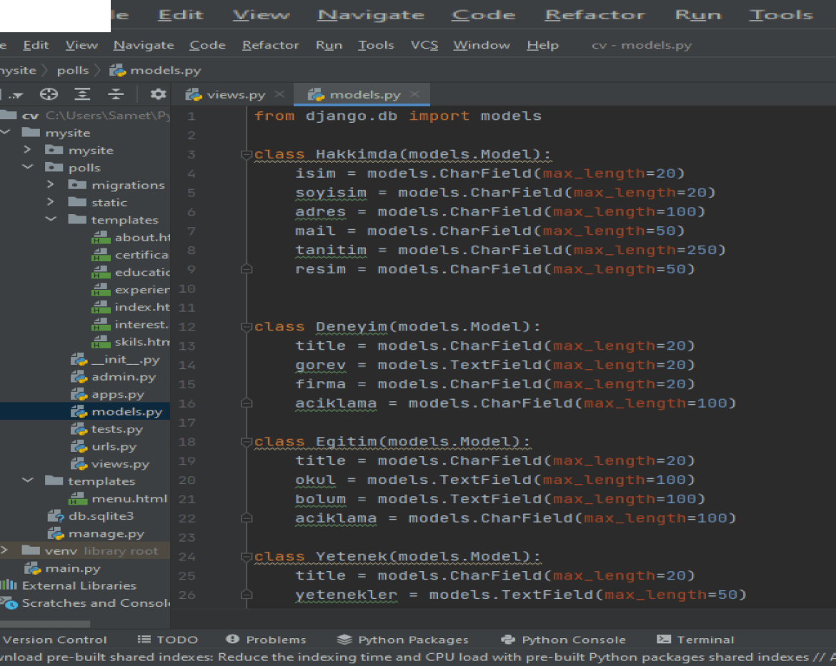 Veri tabanından bahsetmişken artık sırada models.py sayfamız var.