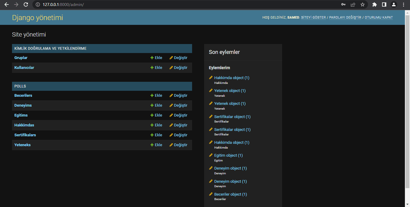 Admin panelimizi kullanabilmek için py manage.py createsuperuser komutunu terminale yazıyoruz. Kullanıcı adı ve şifremizi oluşturuyoruz. İşlem sonlandıktan sonra runserver komtunu çalıştırıyoruz. 127.0.0.1:8000/admin/ surver komutu ile admin panelinize erişebilirsiniz. Burada CRUD işlemlerini gerçeklştirebili, grup açabilir, isetğiniz doğrultusunda sayfanıza başka yöneticiler atayabilirsiniz. Bunların hepsi hazır vaziyette gelmektedir.